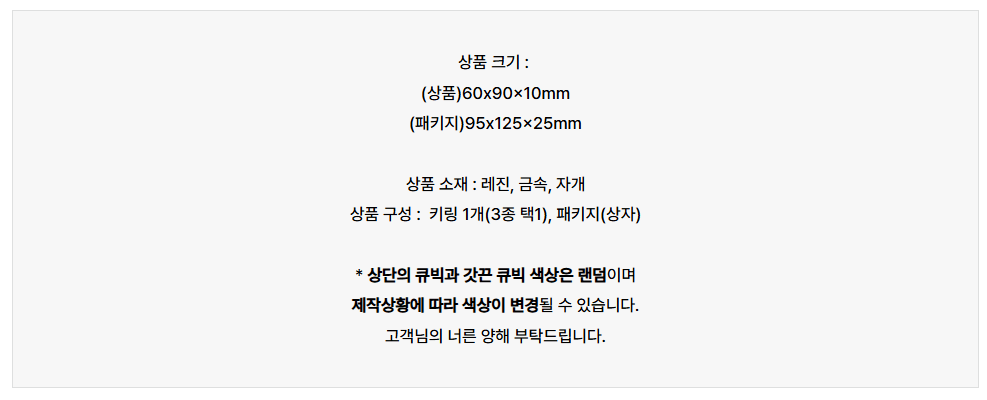 | 구성 | 키링 1개 (3종 택1), 패키지(상자) |