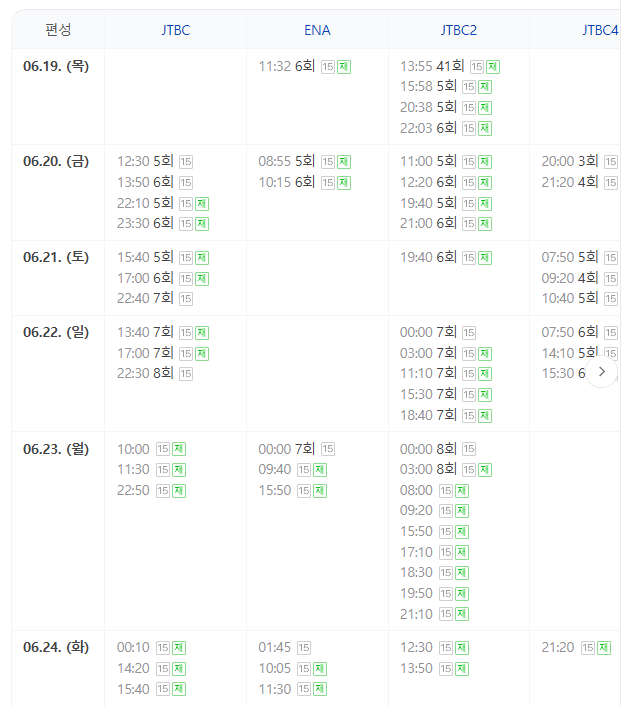 각각 지역의 JTBC2 채널 번호를 잘 확인하시고 재방송 편성표를 참고해 주세요!