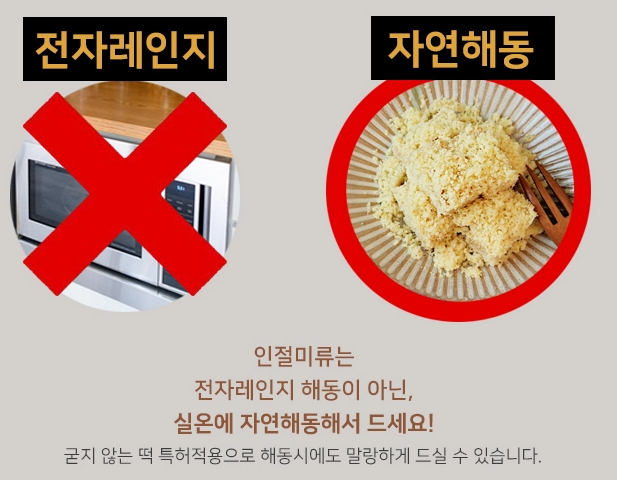 실온 해동만으로 만족스럽지 않을 경우, 밥통에 15분 정도 데워 먹으면 갓 찐 듯한 따뜻하고 쫄깃한 떡을 맛볼 수 있습니다.