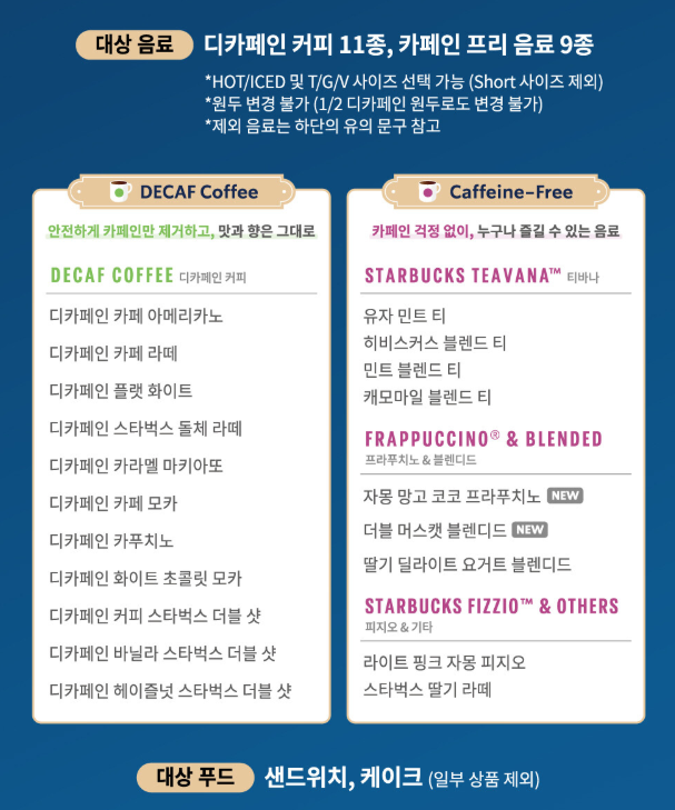 - 디카페인/카페인 프리 음료 + 케이크 = 50% 할인