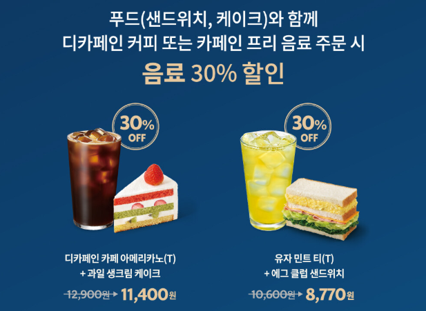 - 모든 제조 음료 (디카페인 포함) + 푸드 = 30% 할인
