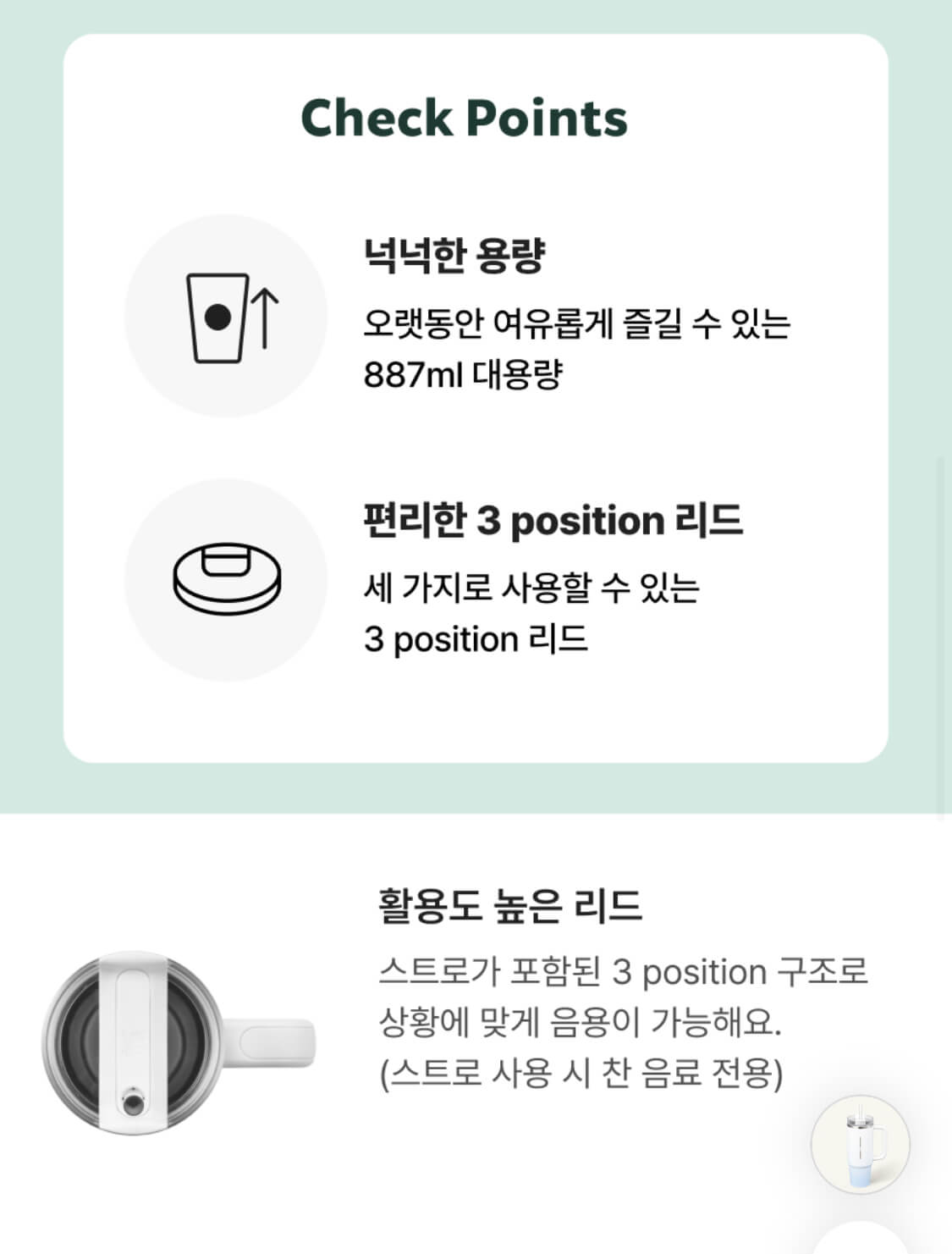 음료를 마시는 방식에 따라 조절할 수 있는 3-position 리드가 적용되어 있어 편리합니다.