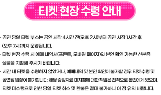 - 선예매 티켓은 공연 당일 현장 수령만 가능하며, 본인만 수령할 수 있습니다.
