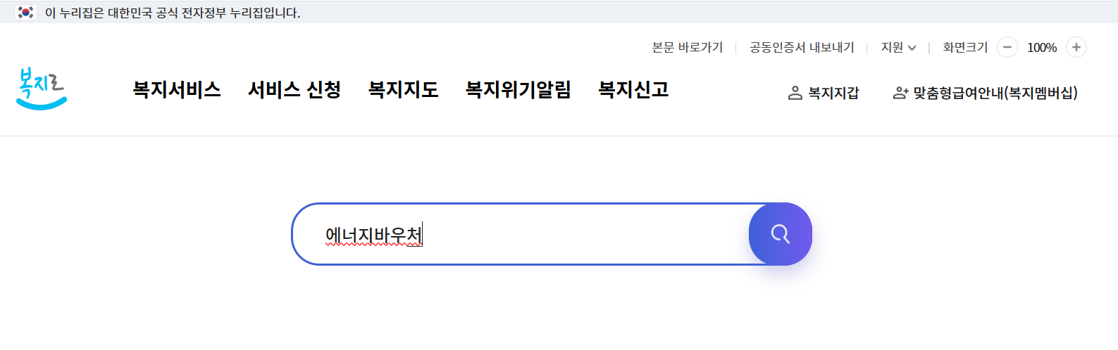 1. 복지로 사이트 로그인하여 [에너지 바우처] 검색