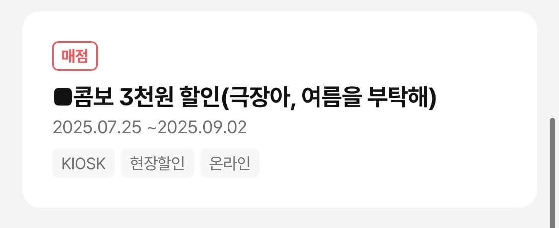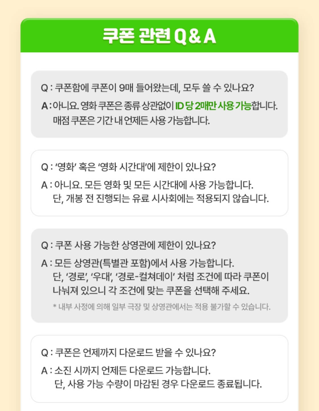 | 3단계 | 영화 예매 시 결제 단계에서 해당 쿠폰 적용하기 | 온라인 또는 티켓판매기(키오스크)를 통해 예매할 때만 쿠폰 적용이 가능합니다. |