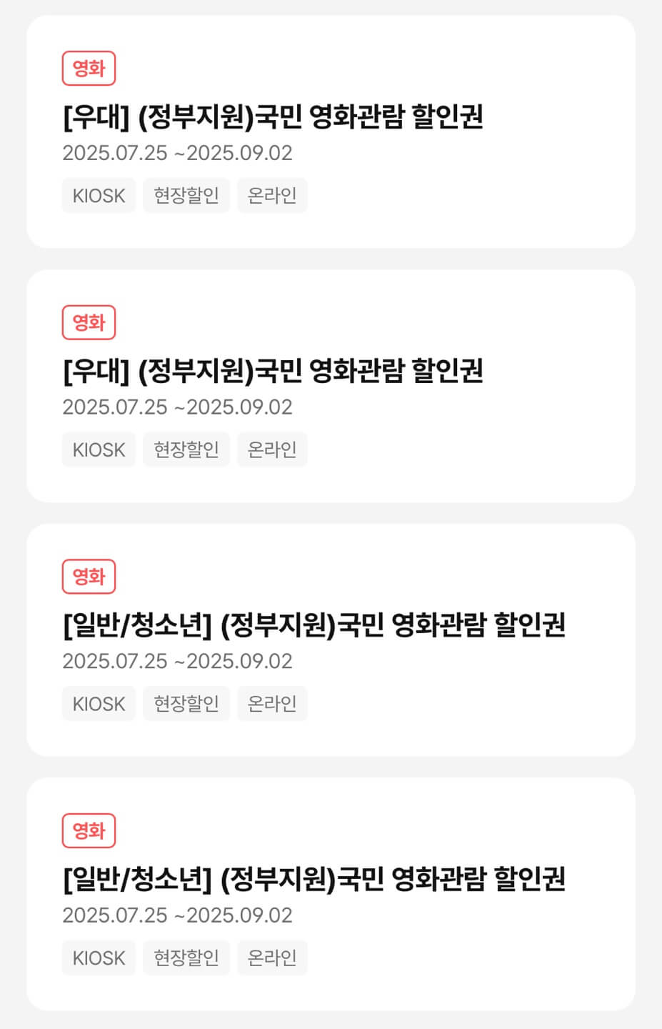 | 2단계 | 이벤트 페이지에서 '정부 영화 할인 쿠폰' 찾기 및 다운로드 | 2025년 7월 25일 오전 10시부터 발급이 시작되었습니다. |
