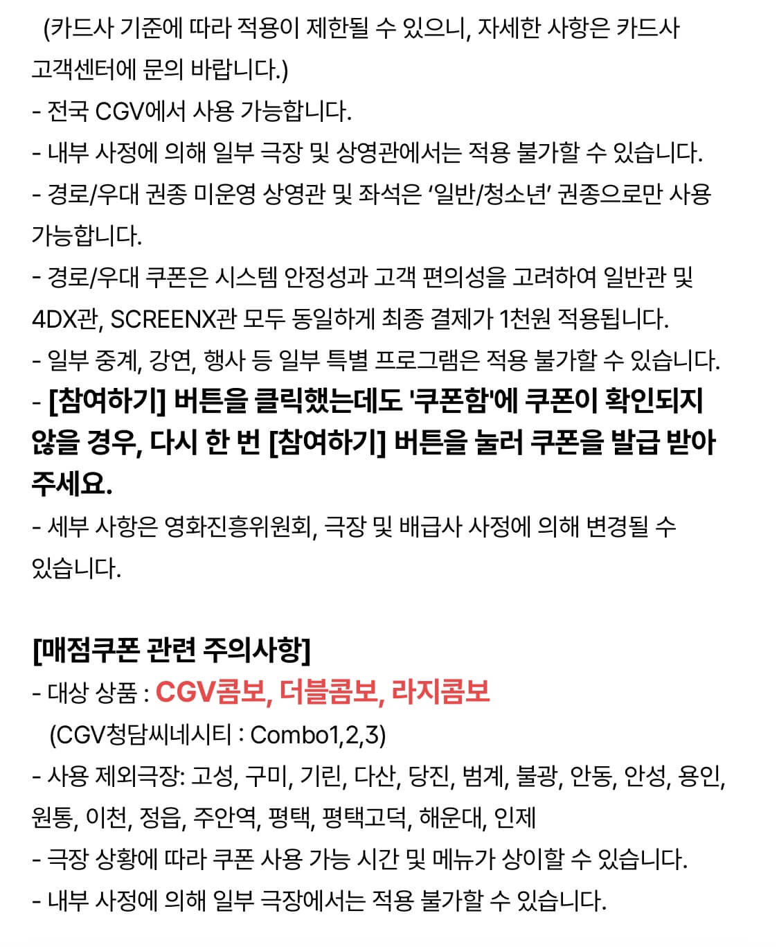 - 쿠폰 적용 우선순위: 예매할 때 여러 쿠폰이 있다면, CGV 시스템이 자동으로 고객님께 가장 유리한 할인(무료 쿠폰, 할인율 높은 순, 할인 금액 높은 순 등)을 적용해 줄 거예요. 이 점 참고해서 예매하시면 된답니다.
