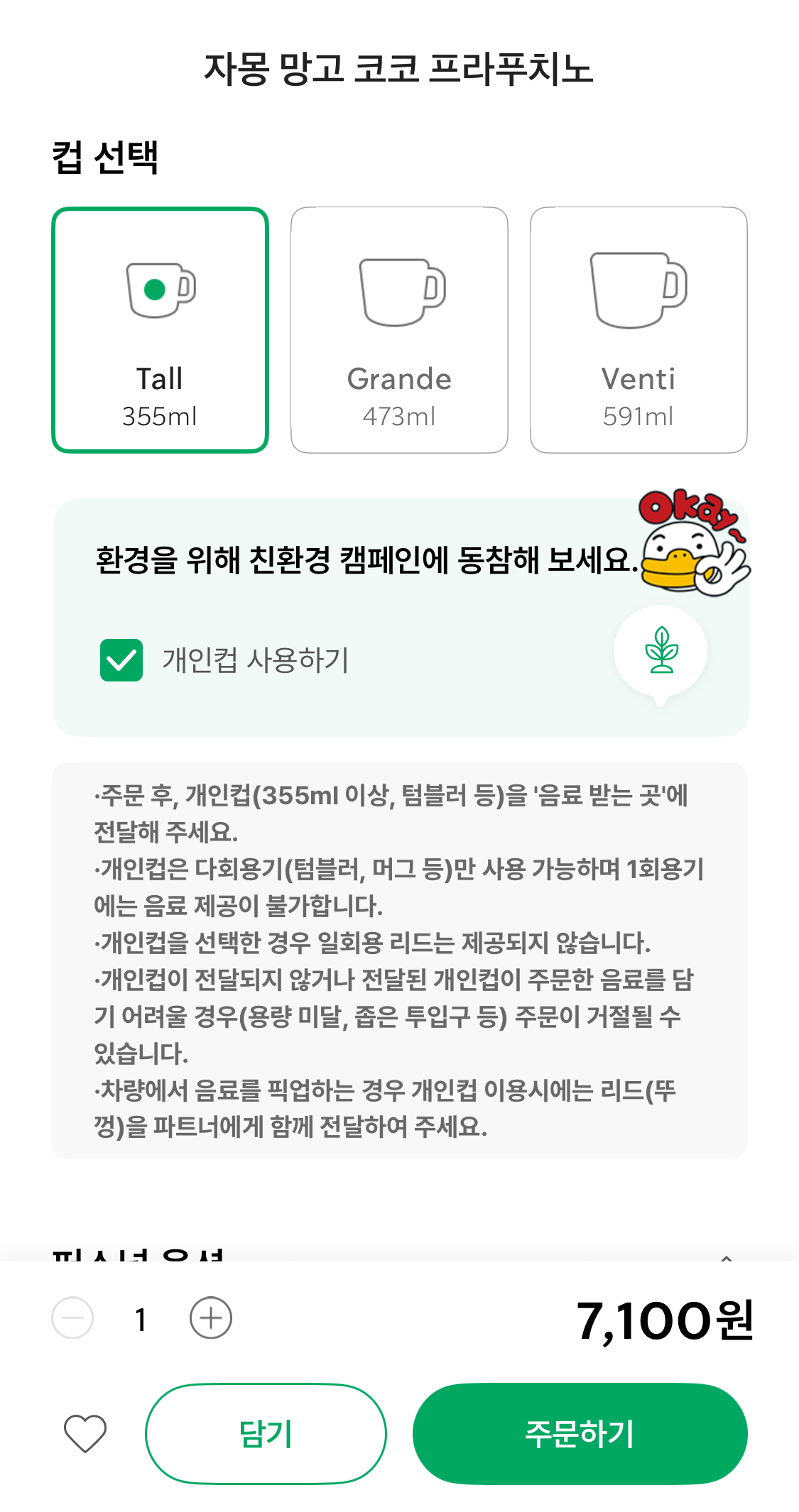예를 들어, 스타벅스에서 사이렌 오더로 주문 시 다회용 컵을 사용하거나 전자영수증을 받는 경우에만 해당 항목으로 적립이 가능합니다.