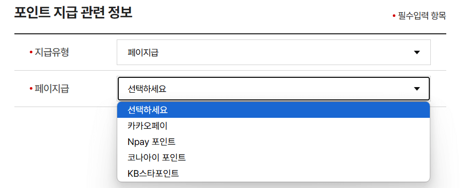 | 페이 | 카카오페이, Npay 포인트, 코나아이 포인트, KB 스타 포인트 |