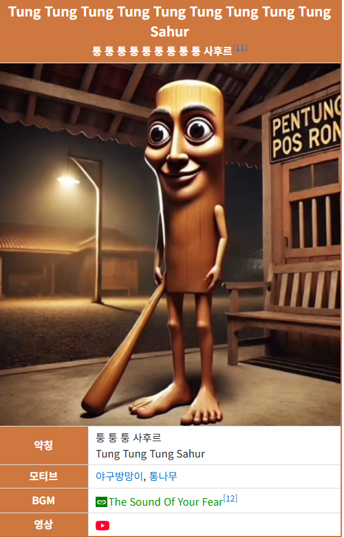 | 퉁퉁퉁퉁퉁퉁퉁퉁퉁 사후르 | 야구방망이 + 개구리 + 타이어 + 사람 다리 형태, '빠따 마스터' | '폭☆8'시키는 장면 연출, '꼰대 기질' 발현 | 김근육 시리즈, 라마단 공포 설정 연관 |