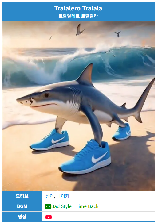 | 트랄랄레로 트랄랄라 | 나이키 신발을 신은 세 다리 상어 | - | 'Italian Brainrot' 밈 |