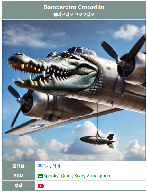 | 봄바르디로 크로코딜로 | 폭격기와 악어가 결합된 형태, 폭격이 주 무기 | - | 'Italian Brainrot' 밈 |