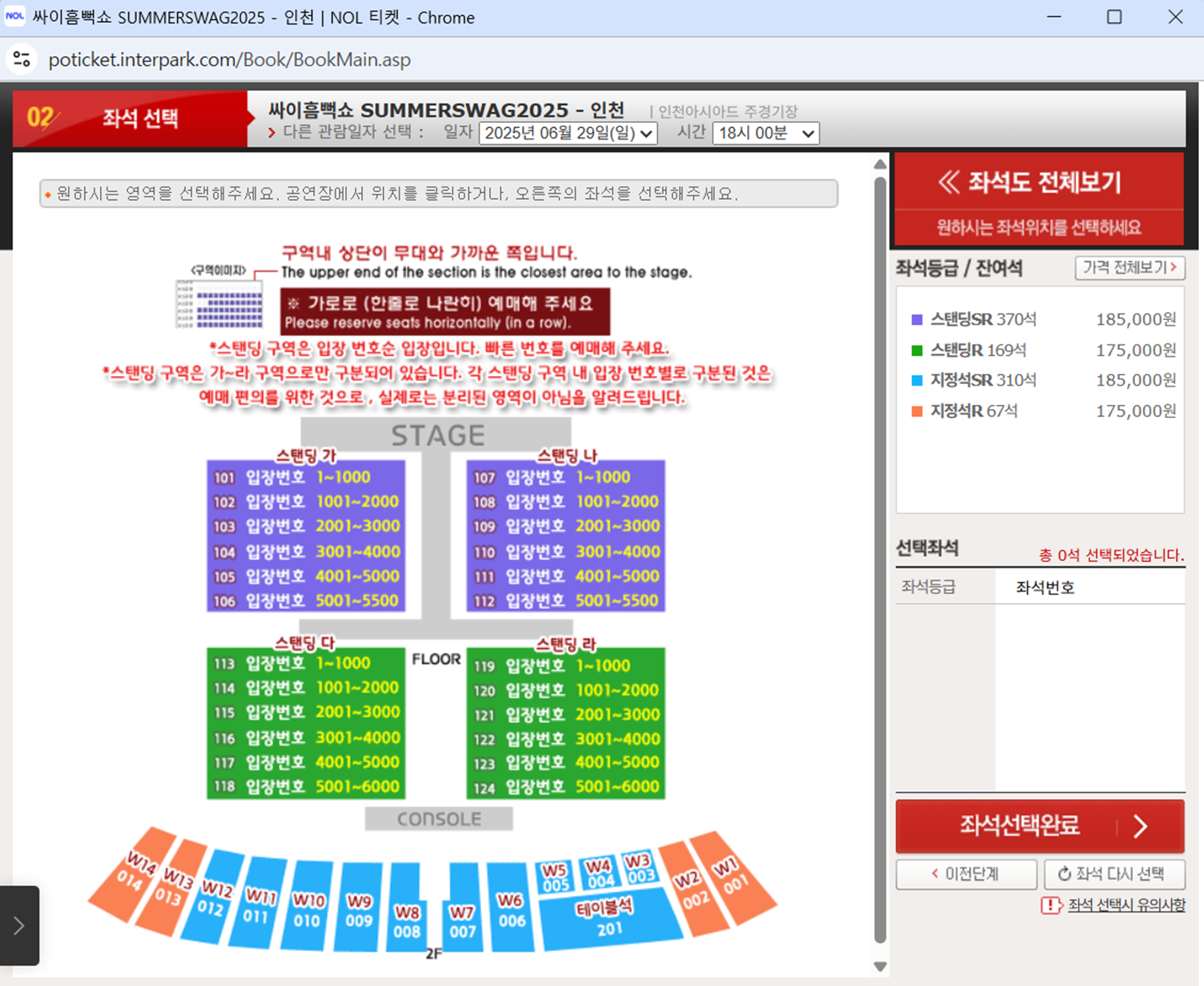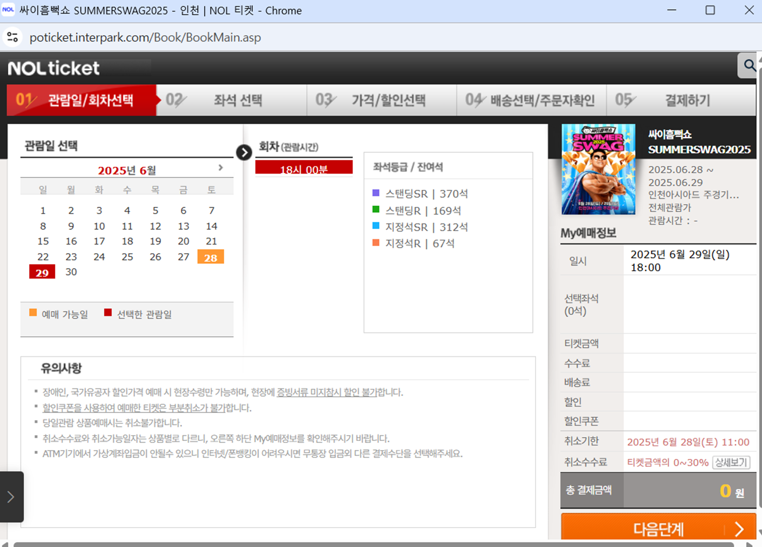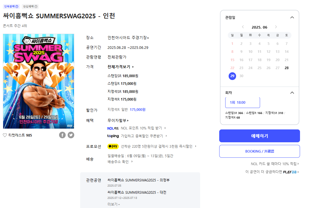 예매 당일, 인터파크 웹사이트에서 '싸이 흠뻑쇼 2025 인천' 전용 예매 페이지로 접속해야 합니다.