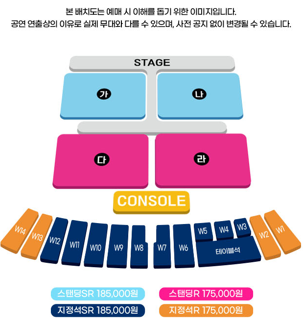 | 지정석SR | 185,000 | 지정석 중 최상위 등급으로, 편안하게 앉아 무대 전체를 조망하며 공연을 즐길 수 있는 프리미엄 좌석입니다. |